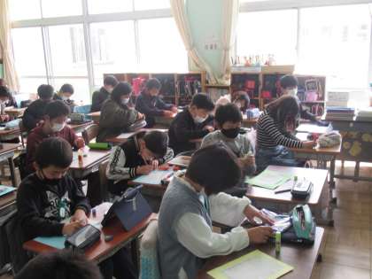 4年生の学活で、1年間のペア活動でペアとなっていた2年生の子に、手紙を書いていました。思い出を振り返ったり、3年生にむけて励ましの言葉を書いたり、相手の顔を思い浮かべながら一生懸命書いていました。いい光景です。
