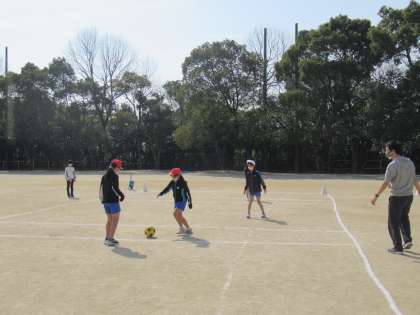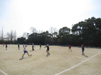 5年生の体育で、サッカーの学習が進んでいます。基本的な技術を高めつつ、ミニゲーム式の練習も取り入れています。ディフェンスをかいくぐり、いかにゴールにつなげるか考えながら活動していました。