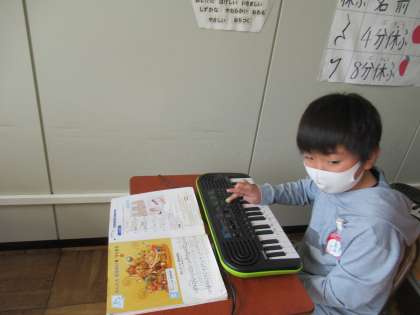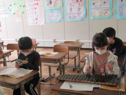 2年生の音楽です。「おしゃべり音楽時計」という曲の合奏をします。木琴、電子キーボード、鈴、トライアングルなどを使い、合奏をします。今日はそれぞれの担当に分かれ、練習をしていました。