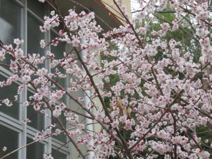 今日は風が強く、桜吹雪ならぬ「梅吹雪」となりました。中庭の梅、保健室前の梅の花は、花びらが散りはじめています。そのかわり、日陰で開花の遅かった体育館前の紅梅だけは、今が満開。卒業式までもってくれそうな雰囲気です。今日もよい一日にしたいと思います。