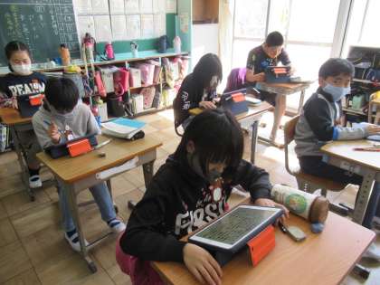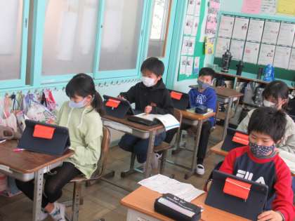 5年生の国語で、「大造じいさんとガン」の学習が進んでいます。学習のまとめとして、物語の続きがあるとしたらどいう話になるか、一人一人が考えていました。今までの読み取りを踏まえながら、じっくりと考えてタブレットに入力していました。