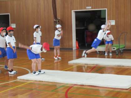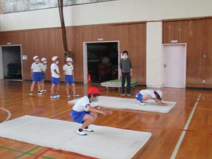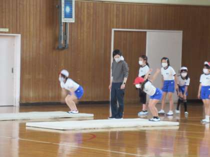 4年生の体育です。体力テストに向けて、立ち幅跳びの練習をしていました。飛び方をどうするといいか、みんなで考えながら、何度も練習を繰り返していました。