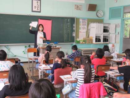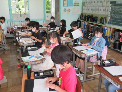 3年生の書写です。3年生から始まった毛筆の授業で、字の練習に入る前の習字道具の使い方を身に着けています。これから長年続く毛筆の授業を支える、大切な指導です。