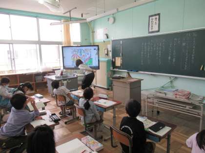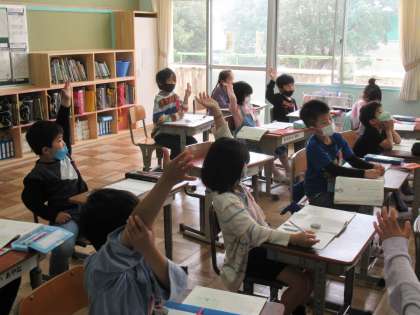 2年生の国語で、「ともだちを さがそう」の学習をしています。教科書の絵を見て、たくさんいる人の中から「ともだち」を探したり、「迷子」の案内をしたりします。どんな情報を言葉にしたらいいか考え、話します。