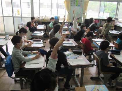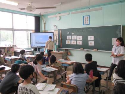 4年生の外国語活動で、天気や遊びを英語で伝える表現を学んでいました。動画、ALTの先生の指導を組み合わせながら、楽しく学習が進んでいます。