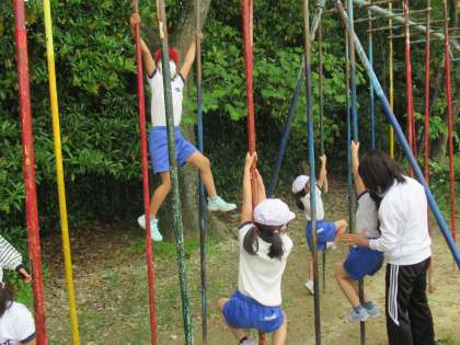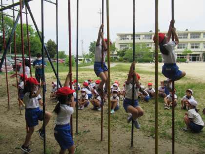 1年生の体育で、器具を使った運動遊びをしています。運動場にあるさまざまな遊具について、遊び方を確認しながらみんなで楽しく活動しました。すでに遊んだことがある子は、やっぱり上手です。待っている子が、一生懸命がんばっている子に拍手する場面があり、とってもいい光景だと思いました。