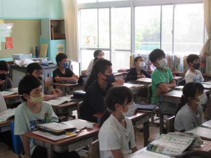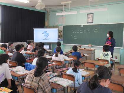 5年生の外国語の授業で、誕生日やほしいものを伝え合う表現を学んでいます。関係する単語を、電子黒板でみんなで確認していました。