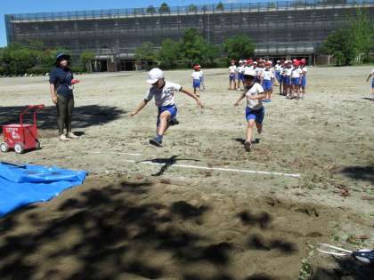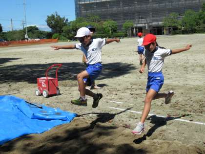 3年生の体育で、走り幅跳びの学習をしています。踏み切りでしっかりと力を入れるために、助走の仕方を練習していました。跳び方を自分なりに考えて、記録アップをねらっていきます。