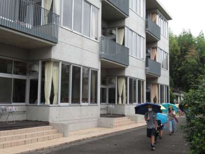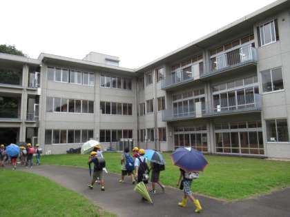 写真のように、長浦の子どもたちは、毎日知多中学校内を通行させてもらっています。今日、子どもらしい名言が聞かれました。知多中の校舎を見ながら、「校長先生、旭北小からみると、ホテルみたいだね!」。なるほど、校舎が新しいので、そう見えますね。きっと高級なホテルのイメージと重ね合わせたのでしょう。表現が子どもならではで、いいなあと思いました。