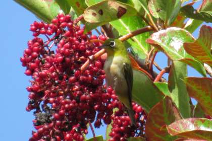 冬から春によく見かけたメジロを久しぶりに見ました。大量のメジロが忙しく飛び回って木の実を食べていました。実の汁を飲んでいるのかもしれません。春を象徴するメジロですが、渡り区分では留鳥ですので、実は年中同じところで定住しています。