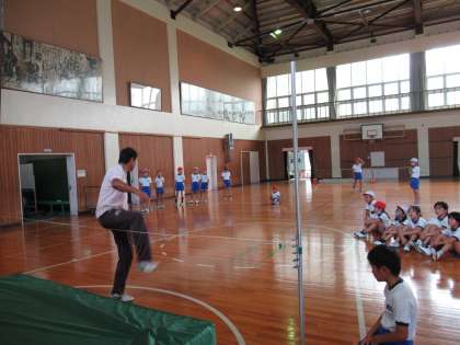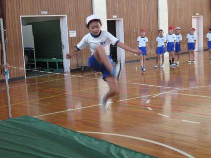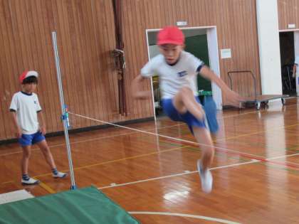 4年生の体育で、走り高跳びの学習をしています。今日は、バーではなくゴムを張って跳び方の練習をしていました。はさみ跳びの足の動きを先生に教えてもらい、何度も繰り返し練習していました。だんだん上達していくので、「とべた!」と喜ぶ子どもたちの笑顔がたくさん見られました。