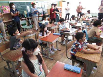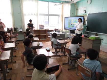 2年生の国語で、「ことばでみちあんない」の学習に入りました。教科書の絵地図を見て、誰にでもわかりやすい道案内の仕方を考えます。校内の現職教育の一環としての研究授業ですので、多くの先生が見守りました。見られるとはりきってしまうのが2年生の良さ。一生懸命にわかりやすい説明の仕方を考えました。