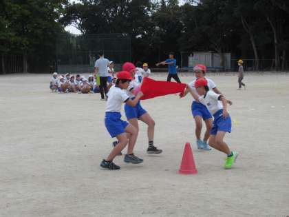 5年生が運動会の練習をしていました。「勝ち取れ!旭北王の座!〜われら旭北王になるものだ!〜」。写真の通り、チームで協力して布でボールを運び、勝敗を競います。まだあまり慣れていないので悪戦苦闘していますが、だんだんとうまくなっていきます。