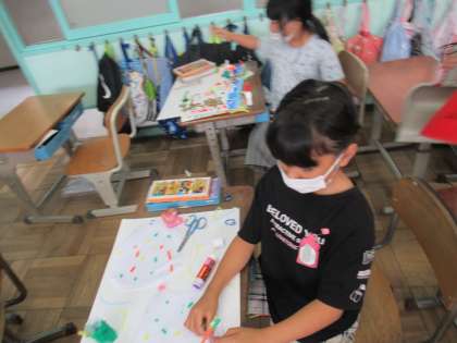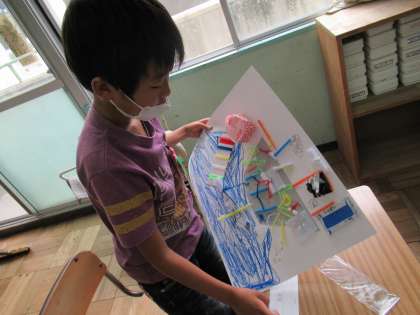 2年生の図工で、「ざいりょうからひらめき」という学習をしていました。ひもや色紙や布など、さまざまな素材からアイデアを膨らませて絵にします。思い通りの世界ができて、みんなうれしそうです。