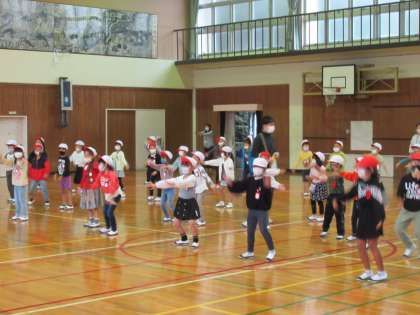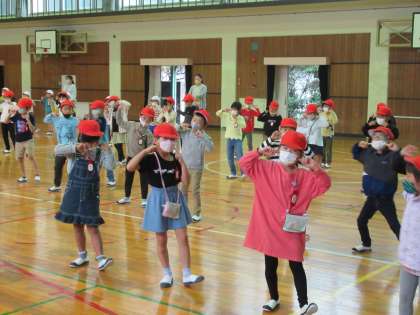 1年生が体育館で運動会の練習をしていました。雨で運動場が使えないので、ダンスの部分を中心に練習をしていました。練習といっても、とっても楽しい活動。いつの間にか、学年としてのチームワークの良さが感じられるようになっています。
