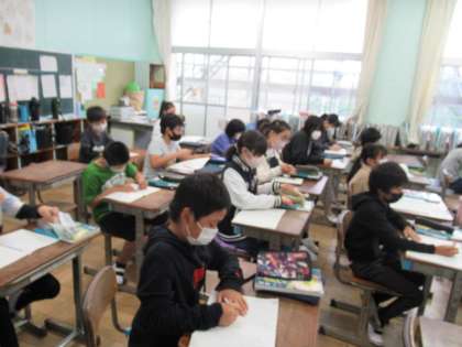 5年生の国語で、「秋の夕暮れ」の学習に入りました。ここでは、清少納言の「枕草子」などの優れた作品を参考に、季節の言葉を使って作品作りをします。心が育ってくる5年生の時期にふさわしい学習です。