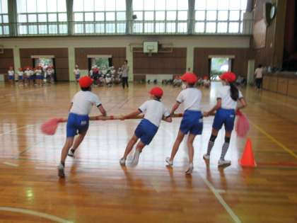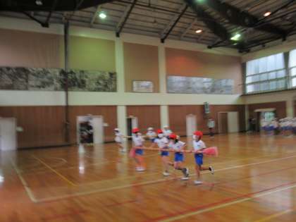 3年生が、雨降りなので体育館で運動会の練習をしていました。学年種目「それいけ!ハリケーン!」の動きの確認です。コーナーの曲がり方がうまくなってきました。