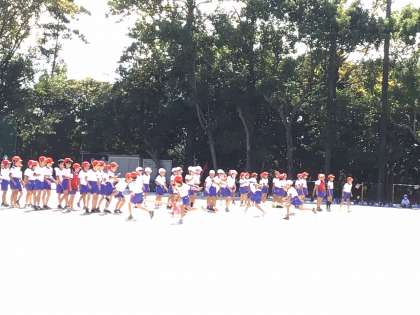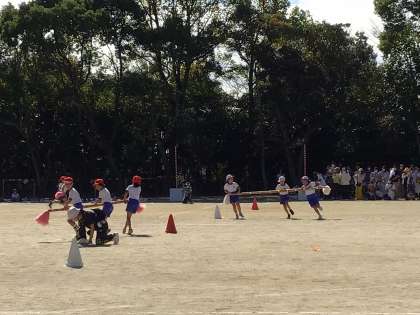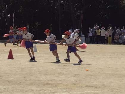 3年生の学年種目が始まりました。「それいけ!ハリケーン!」。チームで力を合わせてハリケーンを起こします。赤と白の対決も、熱が入ってきました。
