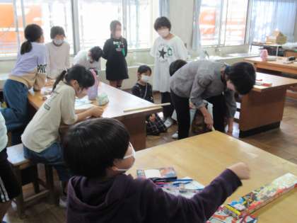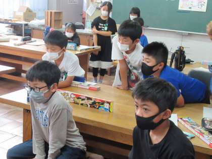 4年生の図工で、「ギコギコトントン」の学習に入りました。その名からイメージできるとおり、のこぎりや金づちを使って木を加工します。道具の正しい使い方を身につける、大事な学習です。今日は、のこぎりの使い方を教えてもらいました。先生のお手本を、みんな食い入るように見つめていました。