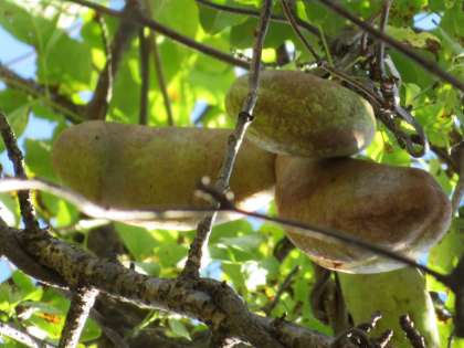 ・果実は厚い果皮に包まれ、ずんぐりした繭形になる。アケビに比べて先端側が膨らみが大きく全体に太い。秋に熟すると、緑色から紫色または赤紫色に変化し、果皮が裂開して中にゼリー状の果肉がある。果肉は白色で、黒色の多数の種子を含む。食用になる。
