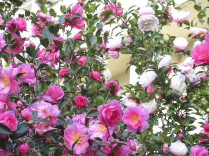 1年生の教室前のサザンカの中から、メジロの鳴き声がしきりに聞こえてきます。花の蜜がお目当てですね。すごいスピードで動いていますが、たまに写真に写ってくれます。どこにいるか、わかりますか?