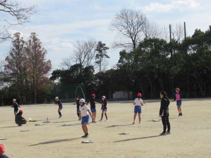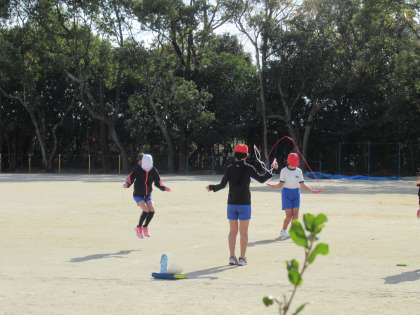 6年生の体育で、なわとびの練習をしていました。6年間練習してきたなわとびですが、体力がついた6年生の段階では、またレベルアップが期待できます。寒さに負けず、がんばっていました。