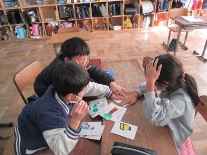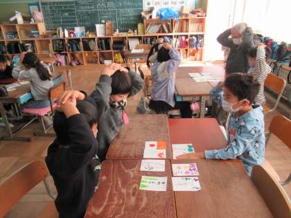 2年生の音楽で、2学期の学習を振り返りながら「曲かるた」を作りました。今日は、いよいよかるた大会。イントロを聴いて、どの曲かを判断してかるたをとっていました。