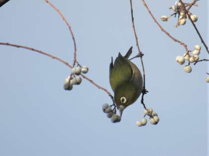 今日はメジロの写真が撮れました。今、旭北小では、実はけっこうたくさんの種類の鳥が見られます。ですが、簡単に写真を撮ることができるのはカラス、キジバト、カワラヒワ、そしてメジロくらいです。その中で、ひときわかわいらしいのがメジロ。とにかく、一年中、何かに夢中になっています。今日はナンキンハゼの実に夢中でした。