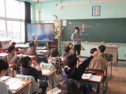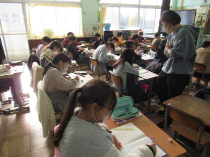 4年生の算数で、「小数のかけ算やわり算」の学習が進んでいます。今日は「商とあまり」の学習。13.6mのテープから3mのテープは何本とれて、何mあまるか。みんなで、じっくりと図を見ながら考えていました。筆算で処理できるようにしていきます。