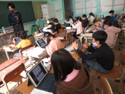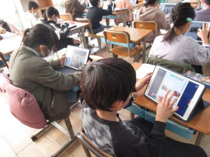 3年生の社会科で、「安全なくらしを守る人々の仕事」のまとめをしています。消防署見学を振り返り、まとめの新聞をタブレットで作っていました。見学時の写真を活用しながら、一人一人が集中して取り組んでいました。