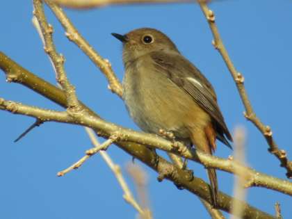南門の木で、ジョウビタキのメスが鳴いていました。冬の間、何度も見かけることができる鳥で、このホームページでもたびたび紹介していますし、1年生の生活科の教科書の「ふゆのとり」のページに紹介されている鳥です。ジョウビタキの「ヒタキ」は「火焚」で、火打石をたたく音に似た音を出すことからつけられています。今日も、しきりに「カチカチ」と鳴き声が聞こえてきて、見上げると至近距離にジョウビタキがいました。