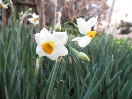 中庭にスイセンが咲いています。花が少ない季節なので、冬の中庭を華やかにしてくれるありがたい存在です。調べたところ、次のようなことがわかりました。