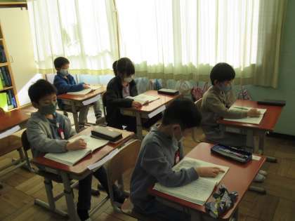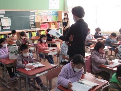 1年生の国語で、「たぬきの糸車」の学習をしていました。素敵な挿絵とともに心温まる物語が展開されます。今日は、教科書の文字を目で追いながら、声に出して正しい読み方を確認していました。