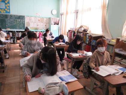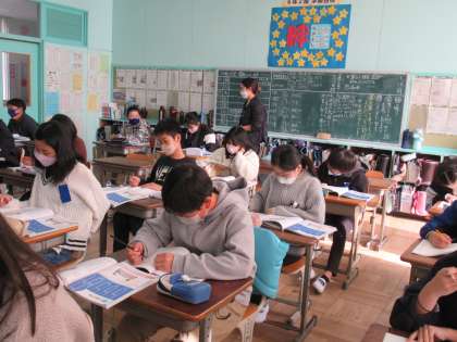 6年生の理科で、「水溶液」の学習が進んでいます。炭酸水、食塩水、石灰水など5種類の水溶液について、性質の違いをどのように調べたらいいか予想を立てていました。直に触ったりなめたりすることは厳禁であることや、実験をした後にどう処理するかも確認していました。