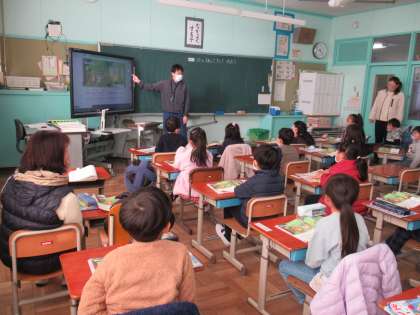 1年生の音楽で、「もりのくまさん」を歌っていました。昔からの定番の歌です。学級の中で半分に分かれて、かけあいを楽しみながら笑顔で歌っていました。