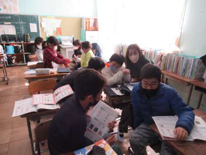 5年生の外国語で「Weicome to Japan. 」の学習が進んでいます。日本の遊びや年中行事などについてたずね合う活動を通して、多くの英語表現を知り、無理なく楽しくコミュニケーションの力を高めています。