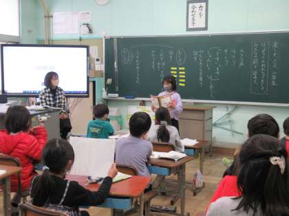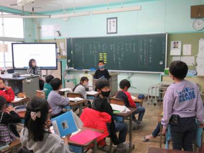 2年生の国語、「楽しかったよ、2年生」の学習で、発表会をしていました。1年を振り返って考えた発表原稿を見て、みんなの前で発表していました。発表のあとは、質問や感想を伝え合い、あたたかなムードで発表会が進んでいました。