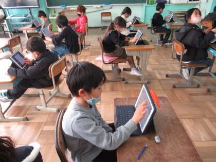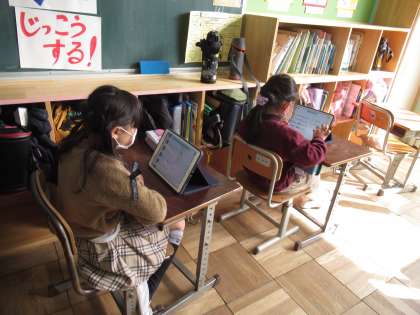 2年生の算数で、タブレットのナビマを使い、1年間に学んだ学習内容の復習をしていました。各自のペースで、復習問題を解いていました。