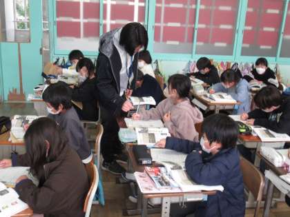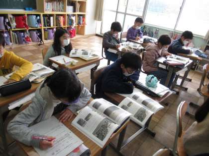 3年生の社会科で、「うつりかわる市とくらし」の学習が進んでいます。副読本「ちた市」にある西知多産業道路ができた頃の様子がわかる資料をみんなで見て、50〜60年前のくらしについて考えていました。