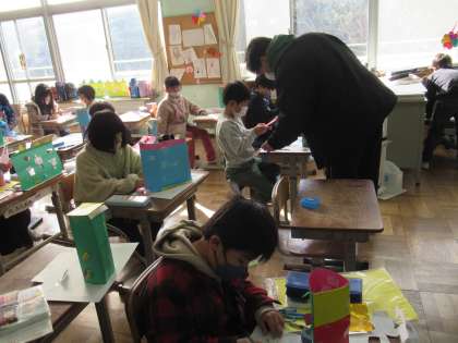 2年生の図工で「まどからこんにちは」の学習が進んでいます。カッターナイフの使い方を身につける学習ですが、すっかりと慣れたようです。完成に近づいてきたので、一人一人の作りたい世界が見えてきて、楽しいです。