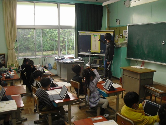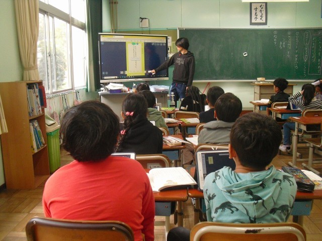 1年生の国語の様子です。一人一人が気づいたことを文章にまとめたものをクラスのみんなに紹介しています。