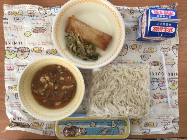 今日の献立は、ソフトめん、牛乳、マーボーソースかけ、愛知の野菜入り春巻き、野菜のナムルでした。
