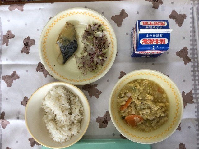 今日の献立は、麦ご飯、牛乳、さわらの西京焼き、高野豆腐の卵とじ煮、キャベツの赤しそあえでした。