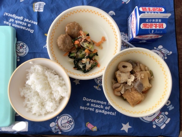 今日の献立は、ご飯、牛乳、レバー入りつくね、豚肉と大根の煮物、野菜とツナのあえものでした。