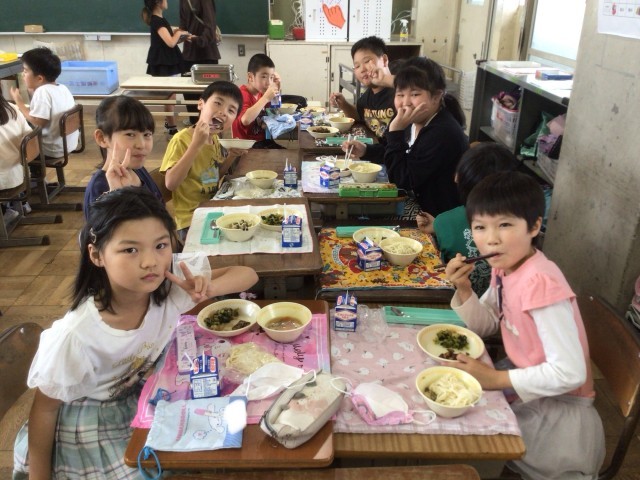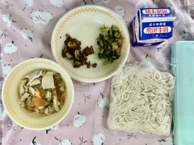 今日の献立は、ソフトめん、牛乳、和風かけ汁、大学いも、野菜のおかかあえでした。