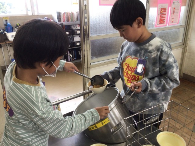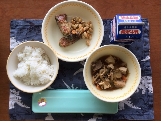 今日の献立は、ごはん、牛乳、ちくわの米粉磯辺揚げ、煮豆、さつま汁でした。