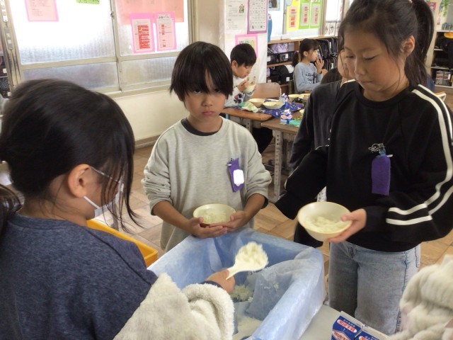 写真は3年3組の様子です。今日は2時間目に「けんこうにすごすためにはどのように食べたらよいのか考えよう」という食に関する指導を行いました。バランスよく食べることの大切さを知った後の給食の時間だったので、苦手なものに挑戦する人の姿がたくさん見られました。