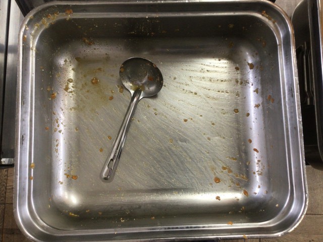 給食ボランティアの子がおかわりの呼びかけをしてくれて、たくさんの子がおかわりをした結果、どの料理もきれいになくなりました。4枚目の写真は煮豆が入っていたバットです!お玉を使って、煮汁やにんじんのかけらまで綺麗にしてくれました!