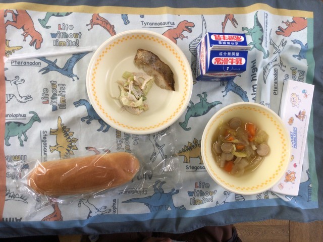 今日の献立は、ロールパン、牛乳、たらのハーブ焼き、ポトフ、れんこんとごぼうのサラダでした。