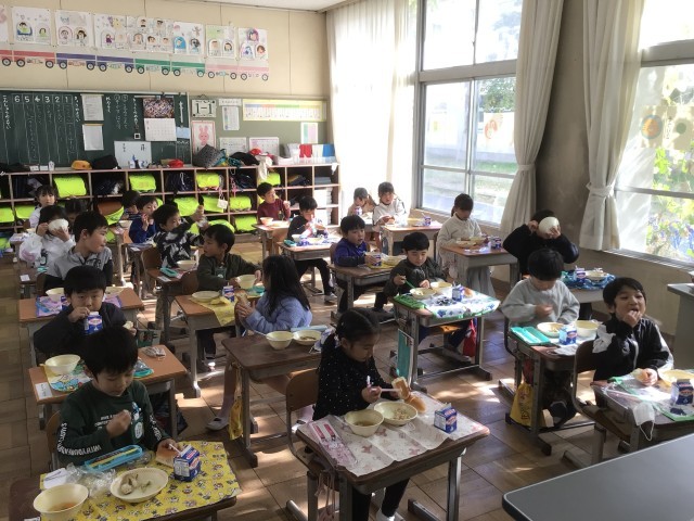 今日はサラダの中にれんこんが入っていました。食べやすいように少し小さく、うすめに調理員さんが切ってくれました。1年生の教室で「れんこんが入っているの見つけたかな?」と声をかけると「見つけた!」と元気な声がかえってきました。そのあとは「♪穴のあいたれんこん」と口ずさんでいる子も多かったです。